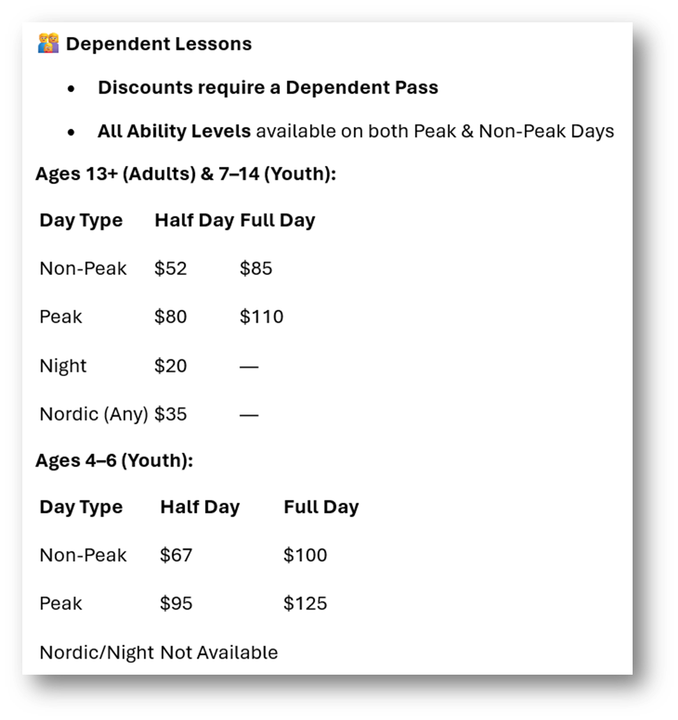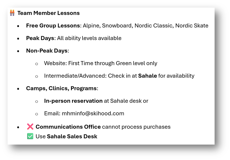 Team Member & Dependent Group Lesson Registration •For Camps, Clinics & Programs, signup in-person in Sahale or email mhminfo@skihood.com•Managers, Directors & Executive teams receive complimentary dependent lessons•Reminder: The communications office cannot process purchases, please visit the Sahale sales desk.To access dependent pass discounts on skihood.com, your dependent pass must be active